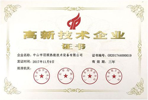 中山市科學技術局出于科研投資和技術成果的綜合考量,根據《中山市工程技術研究中心認定管理辦法》(中山科發(2016)66號)要求下發此項認定,中山市羽順熱能技術設備有限公司成為當年唯一獲此殊榮的壁掛爐整機制造企業。