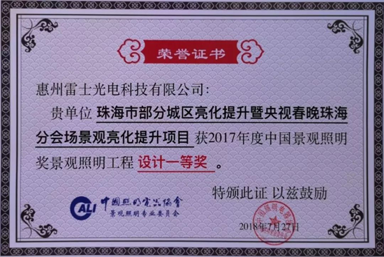 雷士照明“珠海市部分城區亮化提升暨央視春晚珠海分會場景觀亮化提升項目”獲2017年度中國景觀照明獎景觀照明工程設計一等獎