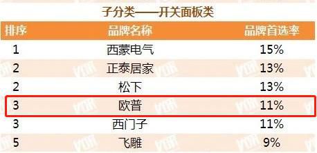 其中,在“照明燈具類”榜單中,歐普以品牌首選率23%排名第一;在“照明燈具類 ”子分類——“浴霸類”榜單中,歐普以品牌首選率14%與飛雕 并列第二,僅次于奧普( 品牌首選率17%);在“建筑電氣類 ”子分類——“開關面板類”榜單中,歐普以品牌首選率11%與西門子 并列第三。