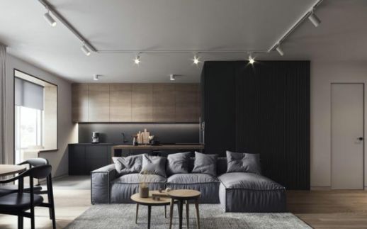 客廳區域,不要主燈,只走了一圈軌道燈,上面的射燈分別照向不同的角度;廚房區域,使用了明裝筒燈的方式提供照明。