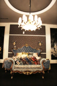 大唐照明展廳的一款歐式吊燈,下面配備了歐式床,場景逼真,光影協調