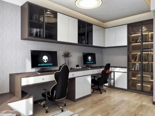 雙辦公區域的定制書房,即可滿足屋主辦公的需求,也可以滿足在家玩電競游戲,穩重的黑、白、咖配色,沉穩中透露出一種舒適與自在。