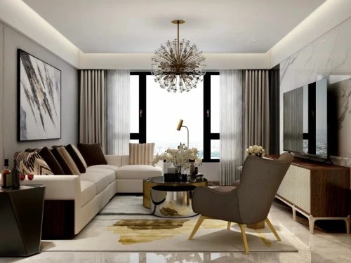米色棉麻質地轉角沙發,搭配石材與金屬材質組合的咖啡桌和幾何線條的角桌,通過不同材質和質感的層次變化,為客廳增添一份現代極簡風和時尚感。
