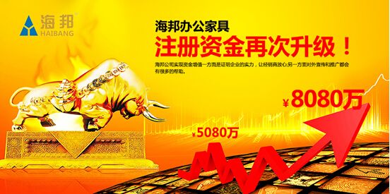眾所周知,一家有實力的企業,外在注冊資金的多少,內在產品的質量,決定企業未來的發展方面。作為中國著名辦公家具品牌海邦原來的注冊資金就有5080萬元,在行業中已屬于佼佼者。當下,注冊資金又升級到8080萬元,如此大手筆的操作,更是令其他同行“望塵莫及”、敬而生畏。
