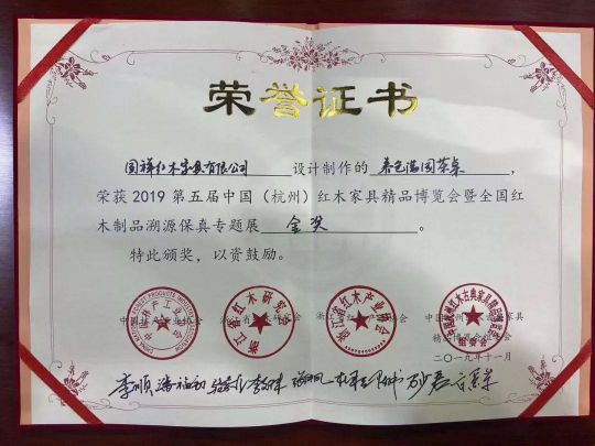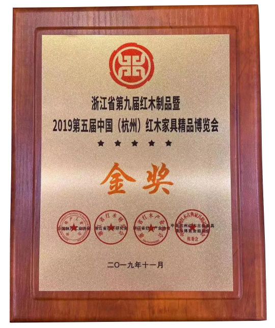 國祥紅木喜獲“浙江省第九屆紅木制品暨2019第五屆中國(杭州)紅木家具精品博覽會金獎”