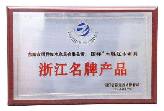 國祥紅木建立迄今屢獲殊榮,已喜獲“浙江名牌產品”、“浙江省知名商號”、“浙江省林業重點龍頭企業”、“東陽市木雕·紅木家具骨干企業”等許多殊榮。