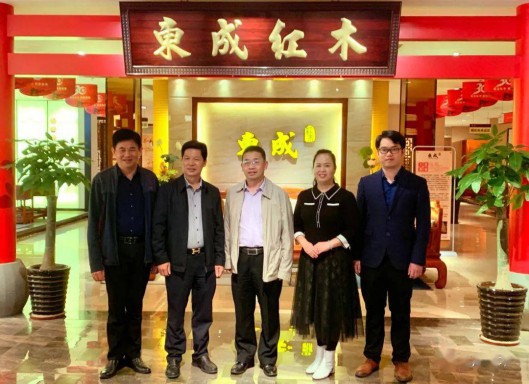 大涌鎮黨委書記王英康(中),東成紅木董事長張錫復(左二)、副董事長林霞(右二)、東成紅木研究院院長謝巧明(左一),東成紅木副總經理張奕海(右一)
