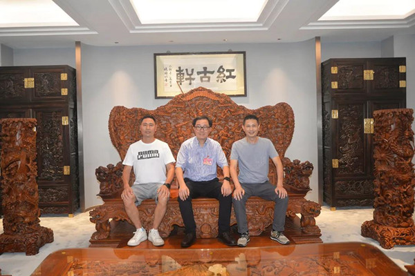市人大常委會副主任關瑞麟(中)與紅古軒創(chuàng)始人吳赤宇(右)、紅古軒生產(chǎn)廠長李仲良(左)落座紅古軒家具合影
