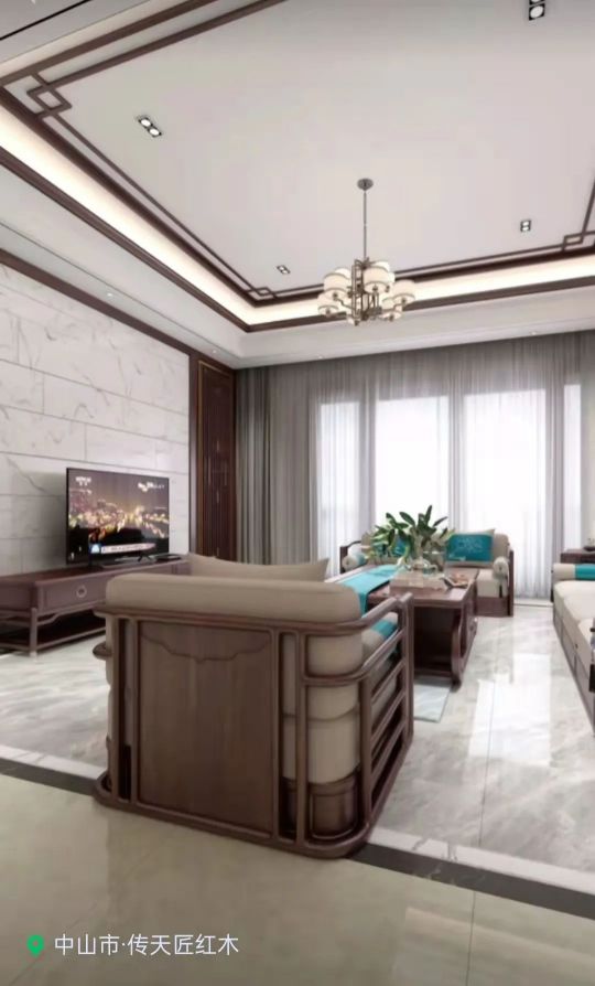 利用簡約的紅木線條將天花勾勒出來,毫不復雜的設計相當輕快,打破紅木整裝傳統的厚重印象。