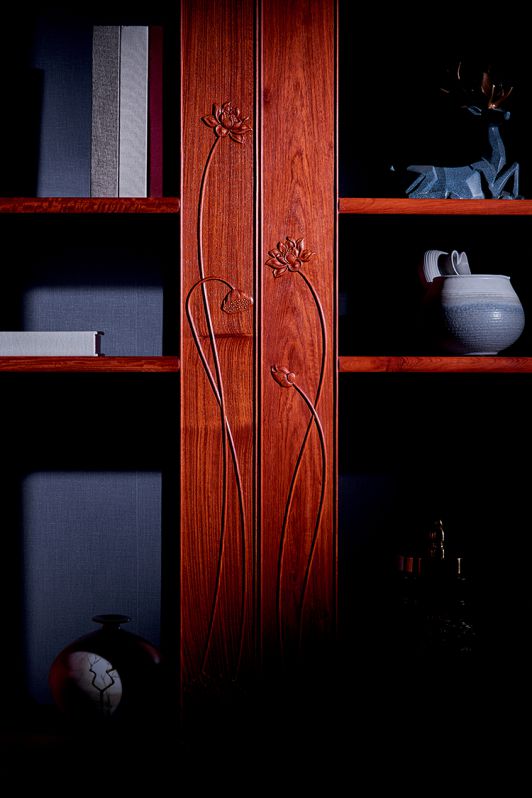 雖然不能從博古架雕花的色彩上區(qū)分蓮花與蓮蓬的狀態(tài),但卻可以從它們的形態(tài)上得知,博古架一邊雕刻的是正在綻放的蓮花,與正在老去的老蓮蓬,另一邊則為含苞待放的花蕾與成熟綻放的蓮花。