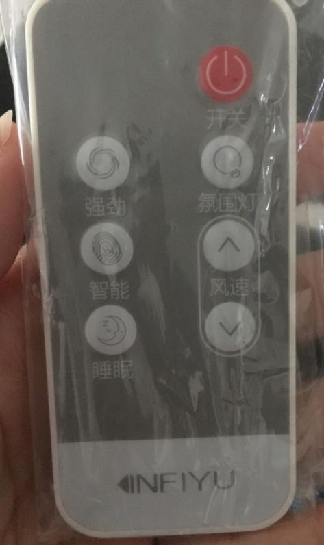 凈化器還附帶了遙控器,可以遠程操作,很方便。遙控器上有7個按鈕,分別是紅色的開關,以及灰色的氛圍燈、風速(上下2個)、強勁、智能、睡眠。
