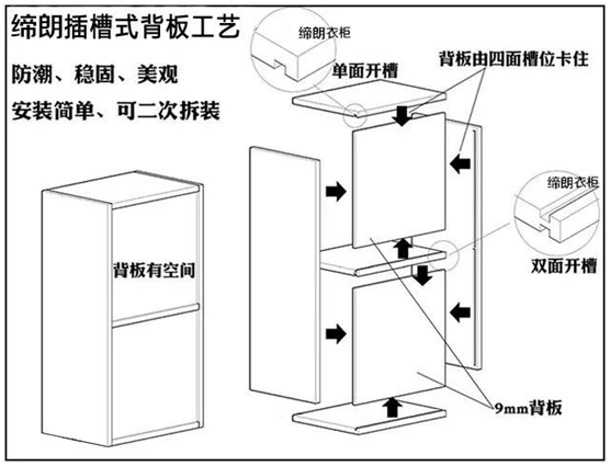 專業(yè)廠家采用厚度9mm或更厚的背板,三聚氰胺貼面,采用嵌槽式反革搭接結(jié)構(gòu),防止背板直接與墻面接觸面吸收墻面上的水分。有些品牌,背板厚度薄,采用釘接式背板連接,背板與墻體直接接觸,墻面上的水份濕氣很容易被板材吸收,容易受潮、發(fā)霉、變形,使柜體失去密封性。