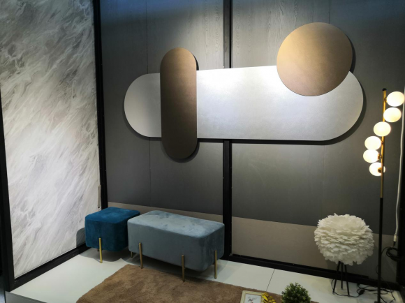 原材料精選,基材環保標準遠高于新國家標準(E1級),達到E0級標準。在顏色的選擇上,顏色大膽、時尚、個性化,有木、鐵、皮、布、石五種主要飾面,可以說滿足了許多客戶的不同需求。在整理過程中,采用高端浸漬紙熱壓基材,施加技術力量進行整理,確保質量和數量。這正是新板材產品受到許多參展商歡迎的原因,而且展位一經推出就非常受歡迎。