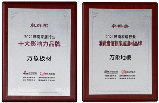 致美好”為主題的2021第五屆湖南家居產業發展峰會暨“卓群獎”頒獎盛典在長沙君悅酒店舉行,這是一場立足當下,放眼未來,為2022年家居行業全域賦能的盛宴。萬象品牌產品萬象板材、萬象地板分別獲得2021湖南家居行業十大影響力品牌獎項、2021湖南家居行業消費者信賴家居建材品牌獎項。