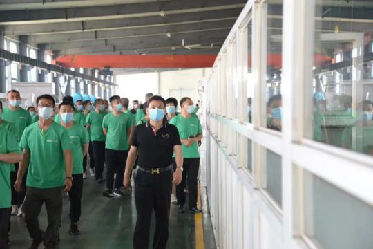 6月3日,華杰木業董事長彭志軍,總經理彭欽泊及生產部、人資部、研發部等50余人團隊一行到訪河北蘋樂集團參觀交流。