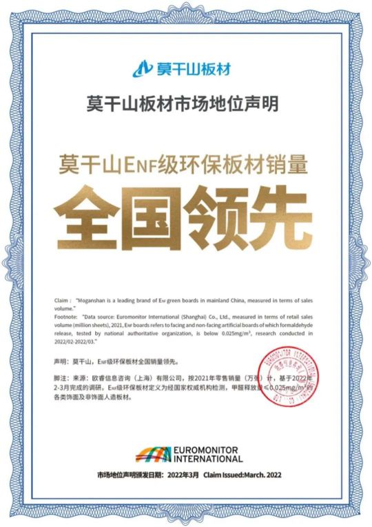 同年,莫干山板材通過歐睿認證,基于對人造板行業各大品牌ENF級環保板材的2021年全國零售市場銷量數據統計、分析和評估,莫干山ENF級環保板材獲得全國銷量領先地位的認證。這意味著莫干山的產品銷量達到新高位。多重認證之下,更顯對母嬰群體的加倍關愛。
