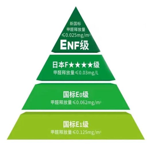2021年,中國GB/T 39600—2021《人造板及其制品甲醛釋放量分級》環保標準正式實施,新增ENF級別。ENF新國標成為了全球人造板行業最嚴苛的環保等級標準,規定甲醛釋放量≤0.025mg/m3,遠超歐美、日本環保標準。