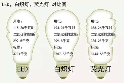 半導體(LED)照明被稱作固態照明,是繼白熾燈、熒光燈之后的新一次光源革命。按平均每天照明6小時計算,一盞LED照明燈與相同照度的白熾燈相比,一年可節約用電約76.65千瓦時,減少二氧化碳排放量107.3千克,節約標煤26.83千克;與相同照度熒光燈相比,一年可節約用電約40千瓦時,減排二氧化碳42.75千克,節約標煤13.68千克。