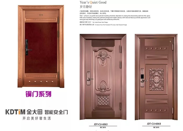 金大田智能安全門,由金大田精選各種高檔不銹鋼、銅質、鋁質、木質等多種新型生態環保原材; 創意設計古典奢華、典雅風尚、經典歐式、經典美式、現代歐式、現代美式、時尚新貴、都市魅力等上千種原創風格,雕花效果精美逼真,產品花樣造型豐富。在產品的風水尺、結構性、安全性、智能性方面,通過改進技術,綜合運用數據通信、網絡設備等技術,成功研發出超越傳統智能門的智能安全門,將自主研發的智能物聯模塊和門完美融合,實現真正意義上門的智能化,全面開啟智能家居生活。