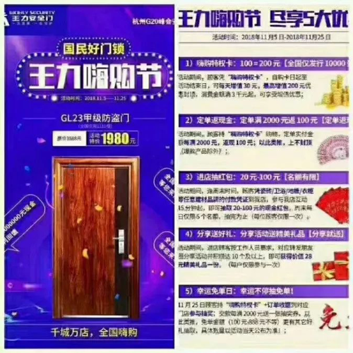 給客戶最好的體驗一直是鄱陽王力玉米木門對自己的承諾,循規蹈就、墨守成規只會讓銷售陷入絕境,因此王力團隊每年至少舉辦五次以上歡購活動,采用新品發布、優惠降價、抽獎、優惠券、精美禮品、合作共贏等措施來給消費客戶真誠服務。同時在銷售市場中,通過與”鄱陽建材聯盟”合作,以獲得更多更優質客戶信息,通過戰略客戶“我為王力代言”活動,以獲得廣大客戶對王力品牌認可。