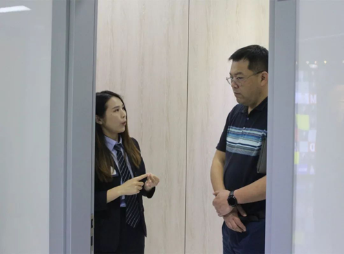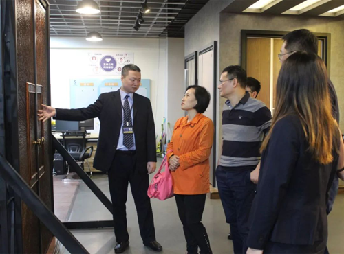 隨后,考察團來到國際門業展廳參觀,在商用門及高端入戶門展廳久久駐足,認真聽取專業人員對美心門產品技術參數、工藝特點等方面的詳細介紹。