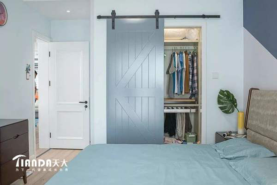 3、衣帽間。個人比較喜歡的是用谷倉門搭配嵌入式衣柜,打造出一個類似衣帽間的空間出來,比起推拉門,谷倉門可是更好看呢。