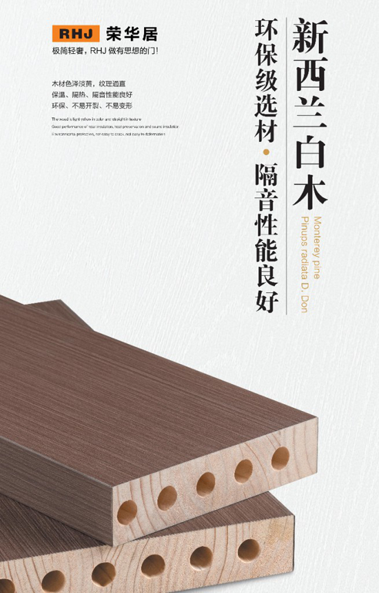 為什么普通定制木門的靜音效果不好?這與木門的材質、墻體、門縫有直接關系的。一般普通木門的隔音效果差就是因為他的龍骨稀疏,門板比較的薄,安裝時縫隙太大所以導致隔音效果并不好。榮華居新西蘭白木定制靜音門,顧名思義是由新西蘭白木鍛制而成,該木材色澤淡黃、紋理通直 ,具有保溫、隔熱、隔音性能良好等特點,且 環保、不易開裂、不易變形。從木材的特性來說,新西蘭白木具有握釘力好,材質變形小、韌性好、紋理好、色澤好、 基材穩定性強等特點,且完好的原木具有無腐朽、蟲咬問題,因此廣泛用于 優質家居及工藝品行業,其材質獲得世界各國的認可。