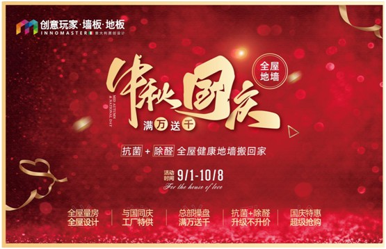 金秋九月,國慶將至。創意玩家時刻心系消費者,竭力為客戶打造品質卓越的多元風格產品,力求給予客戶最實惠的價格與最誠摯的服務。為回饋廣大消費者一直以來的百般信賴與支持,2020年9月1日至10月8日,創意玩家以“中秋國慶·滿萬送千”為主題的全屋地墻優惠活動現正火熱開啟!本次優惠活動,創意玩家又將給予消費者怎樣的優惠福利?以下將圍繞“送”、“特”與“惠”三個關鍵字揭曉答案。