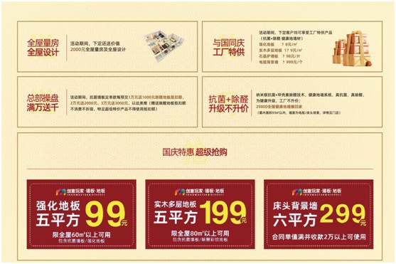 (一)強化地板:99元/五平方米(限全屋60㎡以上可用,包含抗菌墻板/強化地板)