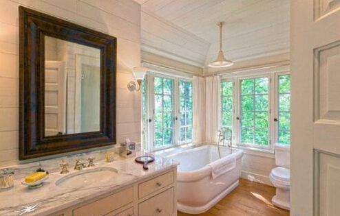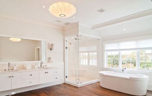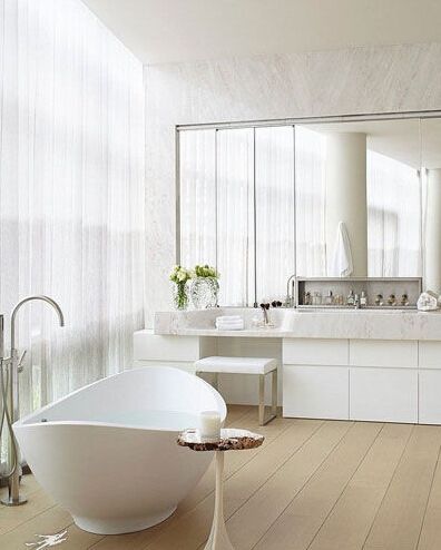 浴室地板圖片5:這款大面積落地窗的浴室,以白色為裝修主調(diào),白色的流線型浴缸和白色的盥洗盆,加上大面積的鏡子,讓空間更清透,視覺空間感更強。地面鋪設(shè)大塊的強化地板,原木色調(diào)更能襯托出白色的純潔無暇。