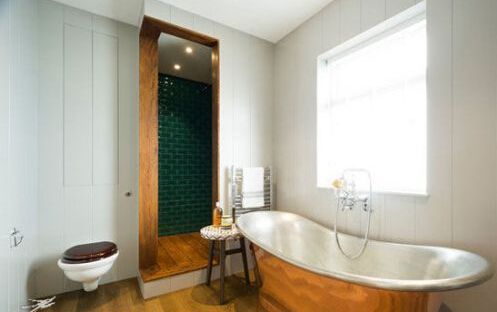 浴室地板圖片2:這款浴室一改以往傳統(tǒng)的衛(wèi)浴間設(shè)計,設(shè)計師將它打造的與臥室等公共空間一樣,實木地板的鋪設(shè)增加了空間的沉穩(wěn)大氣感,而白色浴缸則又為空間增添了些許典雅格調(diào),清雅宜人。