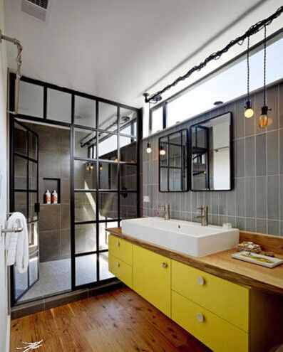 浴室地板圖片6:木質(zhì)地板作為浴室空間的設(shè)計,是一種大膽的嘗試。這款淋浴間設(shè)計,保留了原始結(jié)疤紋理的木質(zhì)地板,讓人有種回歸自然的感受。淋浴間以玻璃窗格來格擋,干濕分離清潔更方便。黃色的浴室柜與原木色地板色彩過渡自然清新。