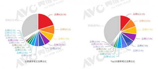 在Top100搜索筆記中,排名第一的依舊是品牌A(占比11.1%),但是第二名是品牌D(占比8.5%),而品牌D在全部搜索筆記中排名第四,同樣的還有品牌E,投放效果較好,在Top100搜索筆記占排名第三。