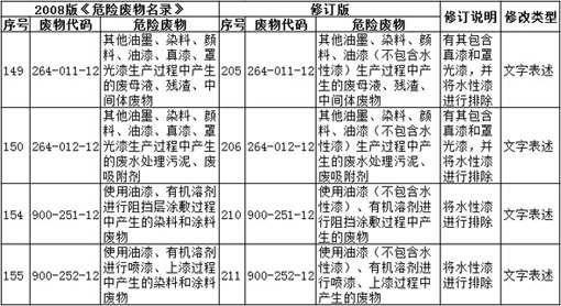 而在這部未出臺(tái)的《名錄》,新聞報(bào)道提到,經(jīng)過(guò)中國(guó)涂料工業(yè)協(xié)會(huì)多次與相關(guān)國(guó)家部委反應(yīng)呢的情況,根據(jù)收到的國(guó)家工信部節(jié)能司“關(guān)于征求《國(guó)家危險(xiǎn)廢物名錄(修訂)》(報(bào)批稿)意見(jiàn)的函”,在最近新修訂的《國(guó)家危險(xiǎn)廢物名錄(修訂)》(報(bào)批稿)中,將涂料生產(chǎn)和使用環(huán)節(jié)產(chǎn)生危險(xiǎn)廢物的條目中加入“不包括水性漆”的括號(hào)注釋,即水性涂料生產(chǎn)和使用過(guò)程中產(chǎn)生的廢物將不被列為危險(xiǎn)廢物。其具體項(xiàng)請(qǐng)看: