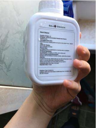 一位試用者陳先生主動向記者提供了他的試用的兩款產品,SEAGREEN抑菌洗手液和SEAGREEN果蔬專用清潔劑,兩款清潔劑都呈褐色而不是我們日常生活中接觸的無色透明質地。