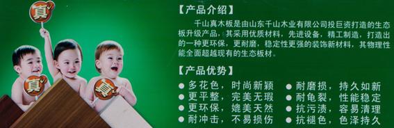 千山真木板作為山東千山木業良心產品,用質量說話,在原有生態板的基礎上改善升級,做到了真正意義上的生態、環保、安全。2015年千山真木板的推出為廣大消費者帶來了福音,是第一款真正意義上媲美天然的生態板板材,裝修請認準千山真木板。