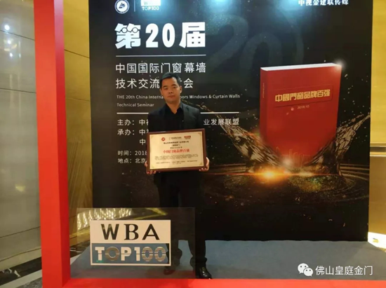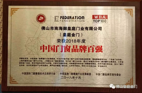 2018年10月30日,這是一個(gè)值得銘記的日子,皇庭金門高端隔音門窗經(jīng)過(guò)12年的歲月洗禮,榮獲中國(guó)門窗品牌百?gòu)?qiáng)企業(yè)稱號(hào)!