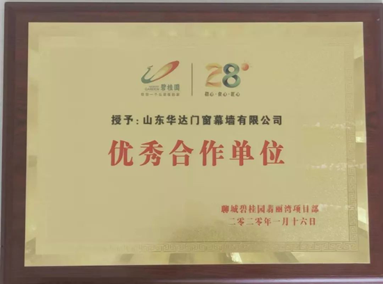 1月18日華達門窗憑聊城碧桂園翡麗灣項目出色表現被碧桂園聊城片區評為“優秀合作單位”。