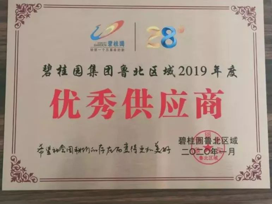 1月14日華達門窗榮獲碧桂園魯北區域“2019年度優秀供應商獎”