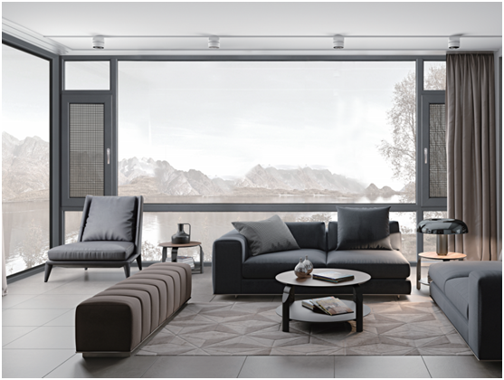 皇庭金門嚴選材質,采用三腔體斷橋隔熱鈦鎂硅鋁合金(6063-T6鋁型材),型材壁厚國際2.0mm,框厚度91.1mm?;释ソ痖T在材料上經過層層認證,在可持續性和環保性上有著極高的工藝要求,有效降低了從門窗傳導出去室外的熱量;還具有出色的隔音性能,解決普通門窗不能有效隔音的弊端。