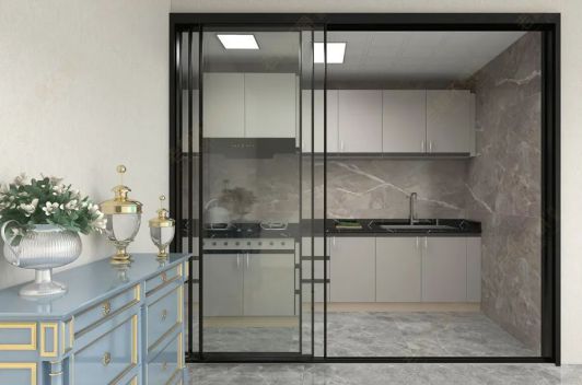 老賴不賴「極美M4極窄推拉門」,嵌入式框扇設計搭配硅化毛條,更能起到隔絕油煙的作用。而且黑色極窄三聯動設計,對于小戶型的廚房來說,不僅能增加美觀性,還能減少視覺阻隔,達到擴大空間視覺感的效果。