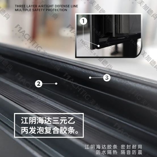 嚴(yán)密的結(jié)構(gòu)設(shè)計與提升門窗整體的性能有著密切的關(guān)系。美加德尚門窗采用整框等溫線垂直設(shè)計,所有的隔熱條和等壓膠條均在同一垂直線上,同時結(jié)合汽車級三元乙丙發(fā)泡膠條進(jìn)行嚴(yán)密封閉,從而實(shí)現(xiàn)良好的隔熱、隔音效果。