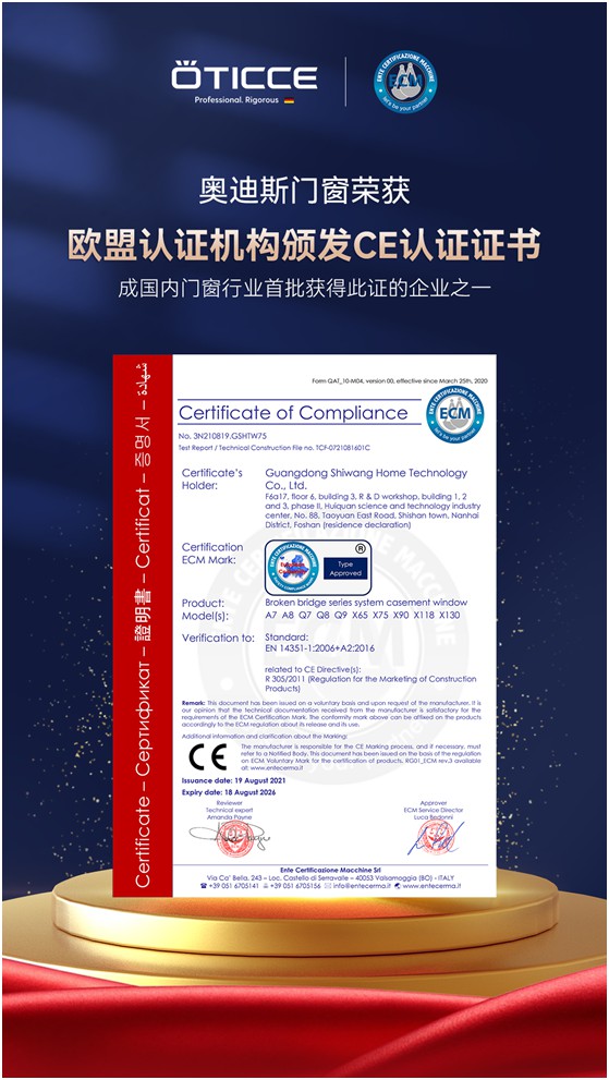 令人矚目的是,奧迪斯是首批獲得歐盟CE認證的國內門窗企業之一。在權威機構的監測之下,經過安全、環保、衛生等重重指標測定,獲得了歐盟認證機構頒發的CE認證證書,也就是取得了奧迪斯產品進入歐洲的通行證。