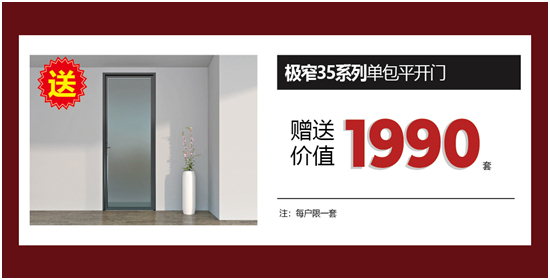 活動期間,消費者選購任意系列窗戶下定金20000元以上,即可贈送價值1990元極窄35系列單包平開門一套,每戶限一套,此優(yōu)惠不與特價產(chǎn)品重疊。