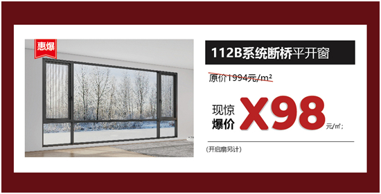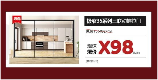 爆款優(yōu)選,極窄系列三聯(lián)動推拉門,原價1560元/㎡,現(xiàn)驚爆價X98元/㎡。精雕細節(jié),性能優(yōu)異,摒棄繁瑣的裝飾,賦予窗戶獨特的藝術。