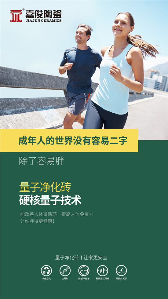 歷經720天的潛心專研,嘉俊陶瓷成功研發出行業科技新品——量子凈化磚。量子凈化磚采用先進的量子技術,在磚的釉面層導入具有專利配方的特殊量子物質,可長期有效地釋放負離子,讓每位追求高品質生活的人,都能擁有如森林瀑布般清新自然又舒爽的居家環境!
