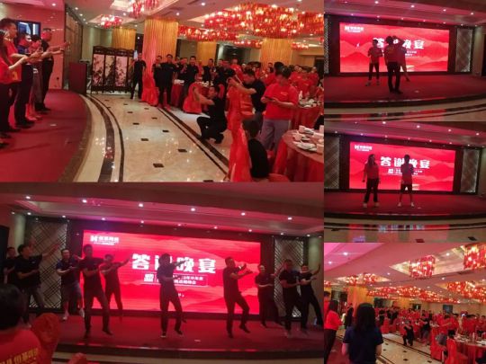 歷時三天三夜的峰會在24日晚的答謝宴會中爆燃,恒基品牌總經(jīng)理賀總攜東道主站點(diǎn)西平代理商李總及家人上臺敬酒,現(xiàn)場杯觥交錯,在一整片此起彼落“以同心致同行,以超越致卓越,干”的口號聲中,總公司業(yè)務(wù)經(jīng)理團(tuán)隊及各站點(diǎn)經(jīng)銷商團(tuán)隊競相上臺獻(xiàn)藝,現(xiàn)場歌舞不斷,一派熱浪!