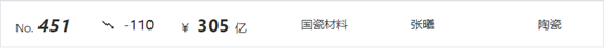 在陶瓷行業相關領域,科達制造、國瓷材料兩家企業上榜。其中,科達制造估值330億元,排名415位;國瓷材料估值305億元,排名451位。