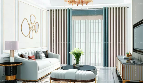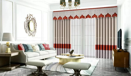 由于客廳的墻面和家居都配有白色色調,過多的白色會讓人感到眼花繚亂和眩暈,所以我們可以用杏色拼淺棕色的窗簾來營造和諧,這不僅協調了客廳的整體色調,讓人感覺舒適柔軟,也展現了主人成熟、穩重、時尚的前衛。