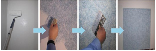 在批好膩?zhàn)拥膲γ嫔希扔瞄L毛滾筒滾涂一道底漆,2小時(shí)后涂刷面漆(采用十字交叉的方式上料),在未表干之前使用刮板,順同一方向輕輕刮涂,使突出表面效果融合的更好,表干后即完成施工。